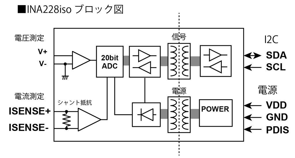 ■すでに販売しておりますINA228電流センサ[#11228]を絶縁型にしたものです。INA228にI2CアイソレータADM3260[#23260]を組み合わせ、電流・電圧を絶縁して計測できます。