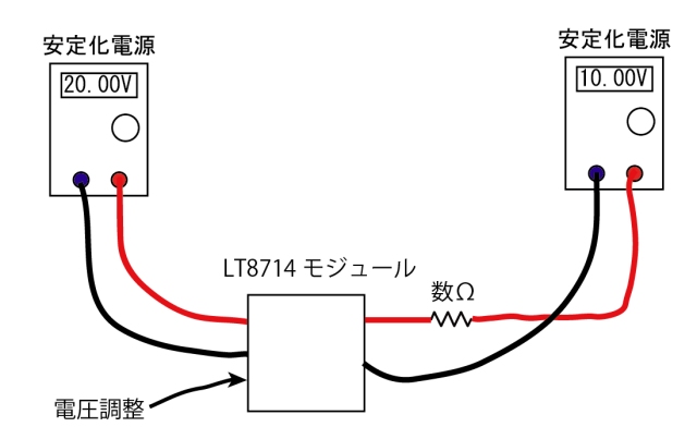 LT8714の電源には20V, 負荷には10Vの安定化電源を接続します。間には電流制限のため抵抗を入れています。CTRLピンを調整することで10V以上(電流の吐き出し)と10V以下(吸い込み)ができます。LT8714の出力が10V以上になると吐き出しとなりますが、実験で使用した10V電源は電流を吸い込まない構造なので電流は流れません。LT8714の出力が10V以下になると負荷の安定化電源10VからLT8714側に電流が吸い込まれます。そしてその電流はLT8714側で消費されないので20Vの安定化電源に戻り電位が上がります。20Vの電源は制御ができなくなり電圧異常で強制停止します。注:安定化電源では異常を検出して停止する製品と、できない製品があります。ACアダプタのような民生機器では逆流すると破損します。