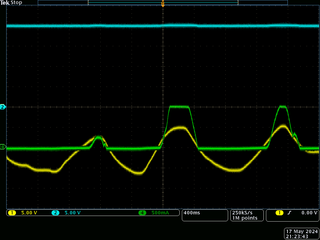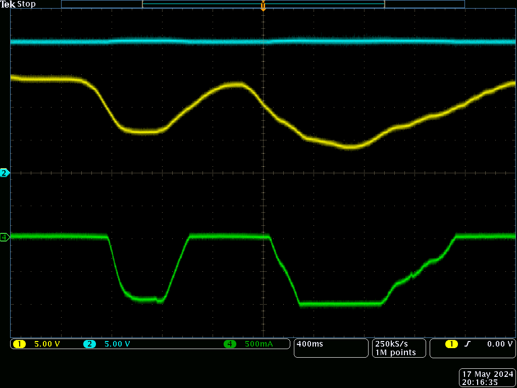 ▼黄色:LT8714の出力, 水色:バイポーラ電源(20Vで動作させています), 緑:抵抗に流れる電流(上に振幅すると負荷からバイポーラ電源に逆流している)