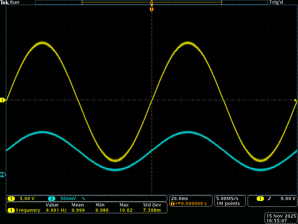 周波数を変化させてみたものがこちらです。実用になるのは商用電源レベルの低周波に限ります。出力振幅はフルスイング(30Vp-p)です。