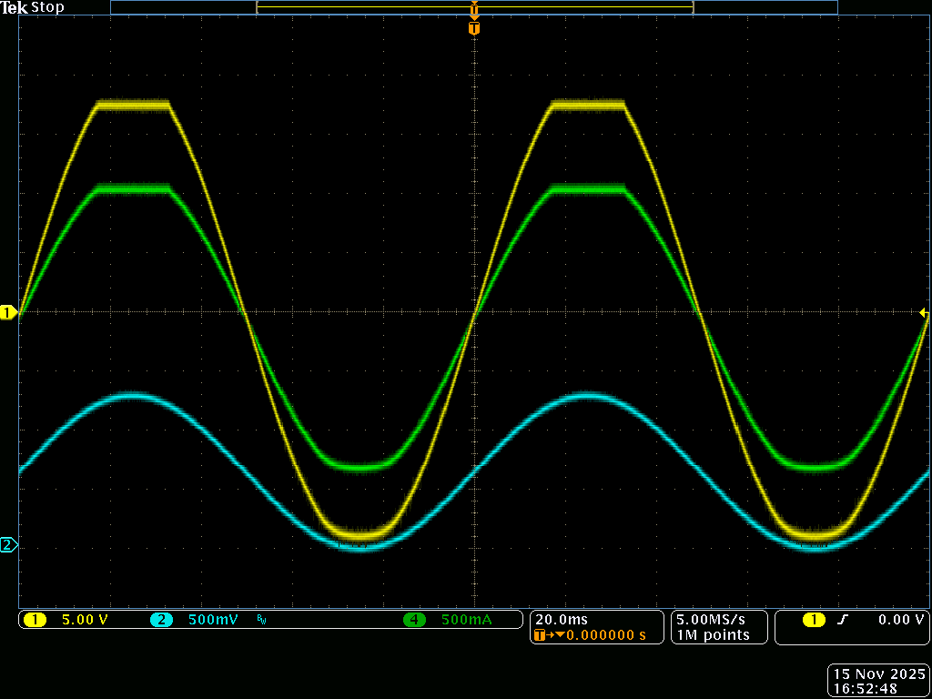 ▼ご覧のように入力信号に追従した電源出力が得られており歪も見られません。抵抗負荷に対して安定した電流を供給しています。スイッチングノイズも見られません。