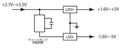 ■正出力は入力からLDOを経由して安定化されます。負出力はチャージポンプで電圧を反転したあとLDOで安定化されます。