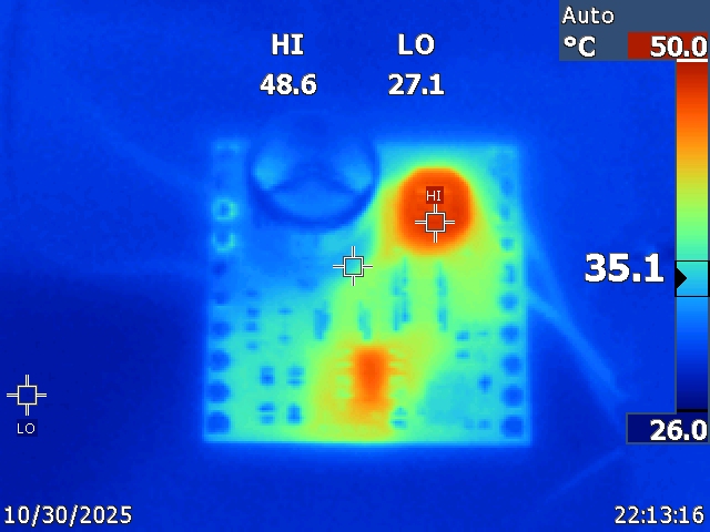 入力48V, 出力5V 0.5Aの最大負荷で使用した時の温度分布です。Ta=26℃, 送風なし、放熱板などの取り付けなし